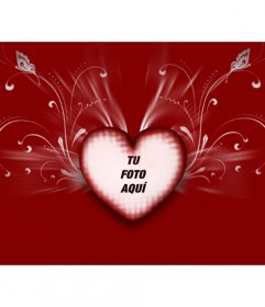 Fotomontaje de amor con un fondo rojo pasión y un corazón en el centro en el que poner tu foto con rayos de luz y líneas decorativas