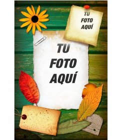 Collage para poner 2 fotos en unas hojas sobre madera decoradas con flores y hojas de árbol