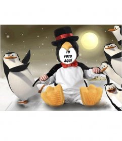 Fotomontaje para hacer con tu foto y ajustar la cara en el rostro de este pinguino bebé rodeado por los pinguinos de la película Madagascar. Sólo debes cargar una imagen y tendrás de resultado un disfraz virtual de un tierno pinguino con un sombrero y sorprende a tus amigos en carnaval con este efecto.